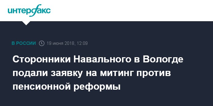 Москва. 19 июня. INTERFAX.RU - Сторонники Алексея Навального в Вологде подали заявку на проведение 5 июля митинга против повышения пенсионного возраста, сообщили активисты на своей странице в одной из социальных сетей.