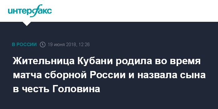 Москва. 19 июня. INTERFAX.RU - Женщина раньше срока родила во время матча ЧМ между сборными России и Саудовской Аравии и решила назвать сына в честь игрока сборной России Александра Головина, сообщил министр здравоохранения Краснодарского края Евгений Филиппов.