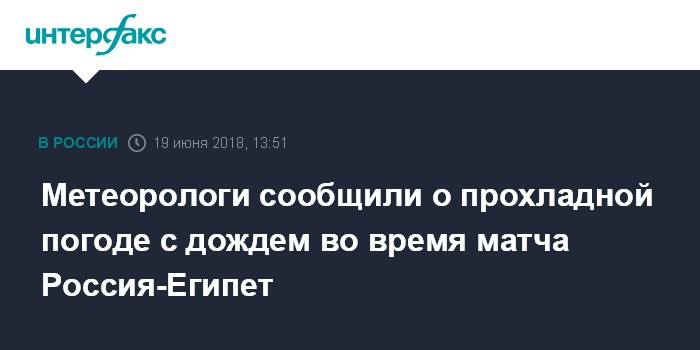 Москва. 19 июня. INTERFAX.RU - Погода во время футбольного матча Россия-Египет, который пройдет во вторник вечером в Санкт-Петербурге, будет прохладной, с небольшим дождем, сообщил научный руководитель Гидрометцентра России Роман Вильфанд.