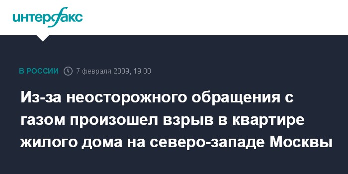 Москва. 7 февраля. INTERFAX.RU - В жилом доме на северо-западе столицы произошел взрыв, пострадавших нет, сообщил "Интерфаксу" в субботу источник в правоохранительных органах столицы.