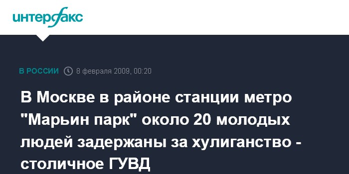 По его словам, в районе станции метро "Марьин парк" в Мячковском саду состоялся концерт, после этого концерта на выходе из сада группа молодых людей начала хулиганить и сотрудники милиции были вынуждены вмешаться. За нарушение общественного порядка были задержаны около 20 человек, всех их доставили в районное УВД после чего отпустили.