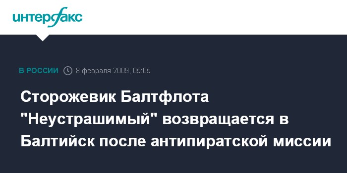Калининград. 8 февраля. ИНТЕРФАКС-АВН - Сторожевой корабль "Hеустрашимый" вернется на главную базу Балтийского флота город Балтийск в воскресенье, сообщили "Интерфаксу" в пресс-службе БФ.