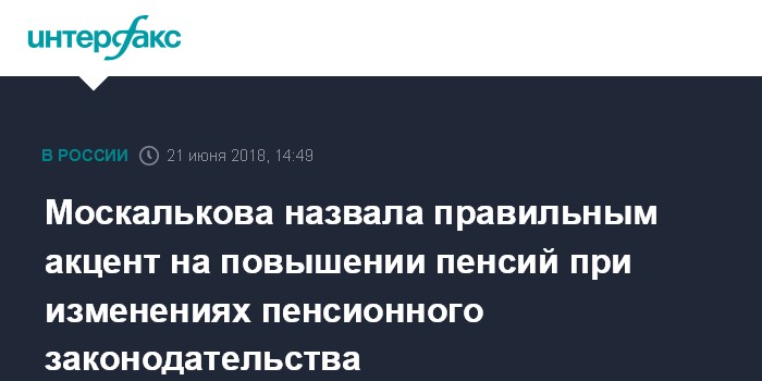 Москва. 21 июня. INTERFAX.RU - Уполномоченный по правам человека в РФ Татьяна Москалькова считает правильной главную цель изменений в пенсионное законодательство - увеличение размера пенсий.
