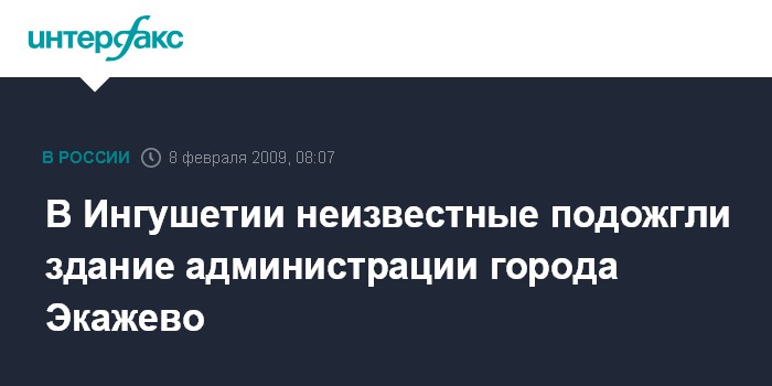 Ростов-на-Дону. 8 февраля. ИНТЕРФАКС-ЮГ - Неизвестные подожгли здание администрации города Экажево в Ингушетии, жертв и пострадавших нет, сообщили агентству "Интерфакс-Юг" в правоохранительных органах Назрановского района.