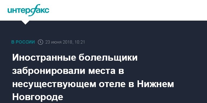 Москва. 23 июня. INTERFAX.RU - Правоохранительные органы проводят проверку по факту бронирования иностранными болельщиками номеров в несуществующем отеле в Нижнем Новгороде. Об этом сообщили журналистам в областном департаменте развития туризма.