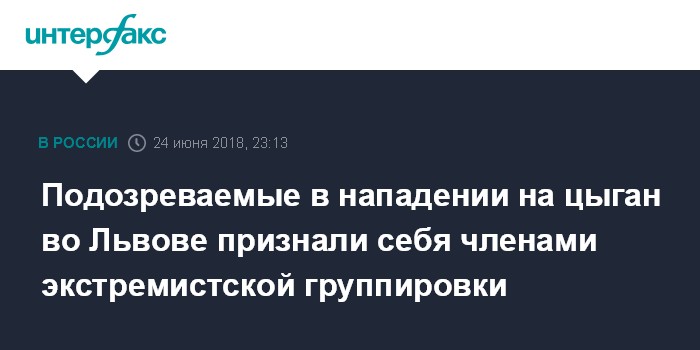 Москва. 24 июня. INTERFAX.RU - Восемь юношей, задержанных за нападение на лагерь цыган во Львове в ночь на воскресенье, признали свою принадлежность к экстремистской группировке, сообщает "Громадське".