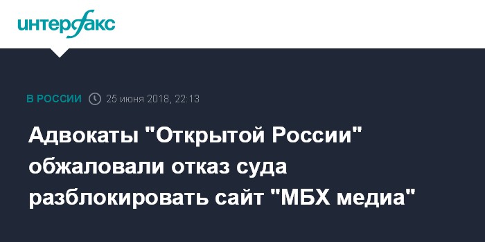 Москва. 25 июня. INTERFAX.RU - Издание "МБХ медиа" обжаловало отказ в разблокировке сайта, сообщает пресс-служба движения Открытая Россия".
