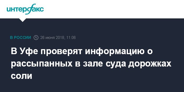 Москва. 26 июня. INTERFAX.RU - Руководство Ленинского районного суда Уфы проверяет достоверность информации о том, что судья Наиля Идиятова обсыпала зал судебного заседания солью, сообщил агентству "Интерфакс" представитель инстанции во вторник.