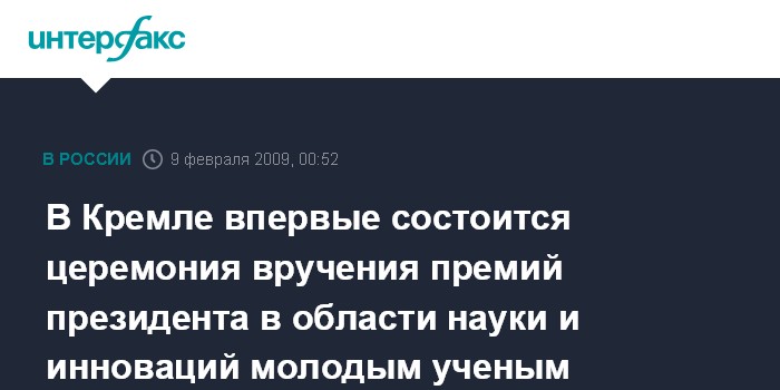 Москва. 9 февраля. ИНТЕРФАКС - Президент РФ Дмитрий Медведев вручит в понедельник в Кремле премии в области науки и инноваций за 2008 год, присужденные молодым ученым.
