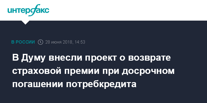 Москва. 28 июня. INTERFAX.RU - Правительство России внесло в Госдуму РФ законопроект о возврате заемщику части страховой премии при досрочном погашении потребительского кредита.