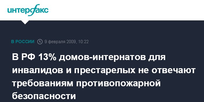 Москва. 9 февраля. INTERFAX.RU - В России каждый восьмой дом-интернат для инвалидов и престарелых не отвечает требованиям противопожарной безопасности, заявил заместитель главы МЧС РФ Александр Чуприян.