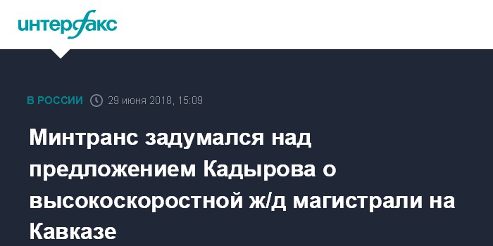 В письме, направленном 15 июня, Кадыров сообщил, что ОАО "Российские железные дороги" планирует строительство выделенной высокоскоростной линии Центр-Юг (Москва-Адлер), а также Ставрополь-Невинномысск-Минводы, добавляло издание. По его данным, Путин поручил главе министерства экономического развития РФ Максиму Орешкину и министру транспорта РФ Евгению Дитриху рассмотреть возможность включения проекта в программу и доложить об этом.
