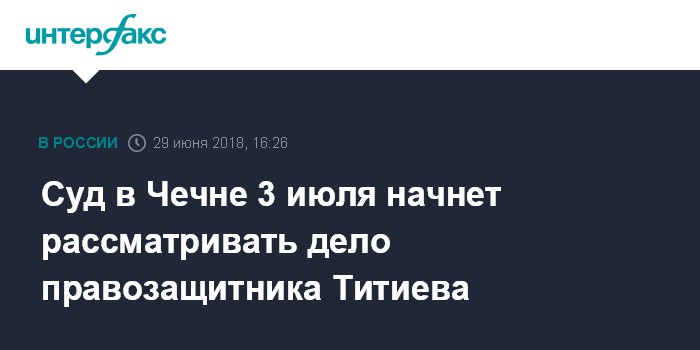 Москва. 29 июня. INTERFAX.RU - Шалинский городской суд 3 июля приступит к рассмотрению уголовного дела о хранении наркотиков в крупном размере в отношении руководителя чеченского представительства правозащитного центра "Мемориал" Оюба Титиева.