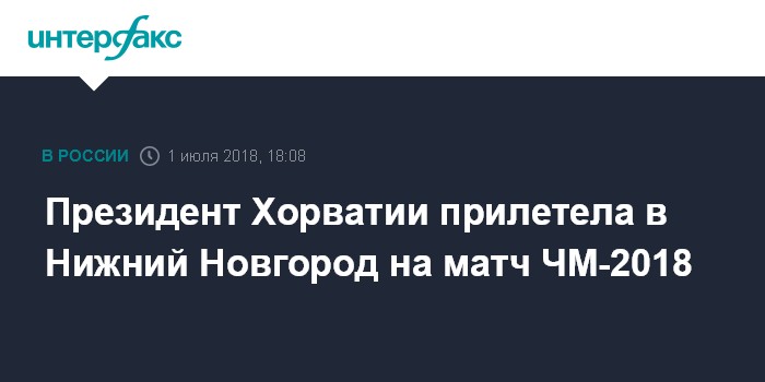Москва. 1 июля. INTERFAX.RU - Президент Хорватии Колинда Грабар-Китарович прибыла в Нижний Новгород, где ее национальная сборная в воскресенье встретится с командой Дании в 1/8 финала чемпионата мира по футболу (ЧМ-2018).