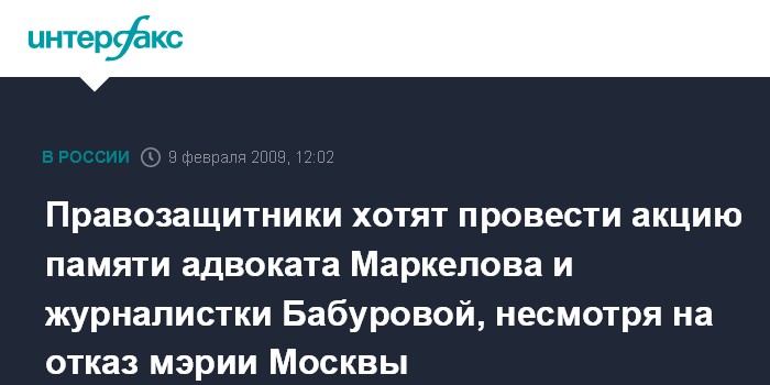 Москва. 9 февраля. INTERFAX.RU - Правозащитники рассчитывают, что им удастся провести в воскресенье, 15 февраля, шествие и митинг в центре Москвы в память об убитых адвокате Станиславе Маркелове и журналистке Анастасии Бабуровой.