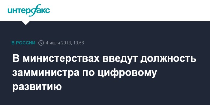 Москва. 4 июля. INTERFAX.RU - В ключевых российских министерствах планируется ввести должность заместителя министра по цифровому развитию. Соответствующее поручение дал премьер РФ Дмитрий Медведев, заявил глава Минкомсвязи Константин Носков на конференции "Цифровая экономика: прорыв в будущее" в аналитическом центре при правительстве РФ.