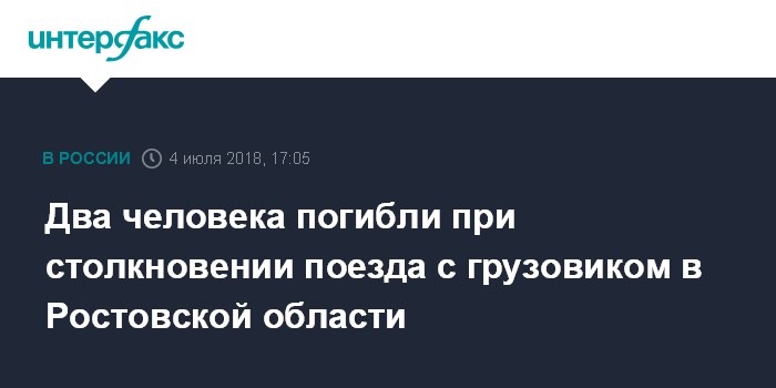 Москва. 4 июля. INTERFAX.RU - Пассажирский поезд столкнулся с грузовиком под Ростовом, погибли два человека, сообщил "Интерфаксу" источник в службе "Скорой помощи" региона.