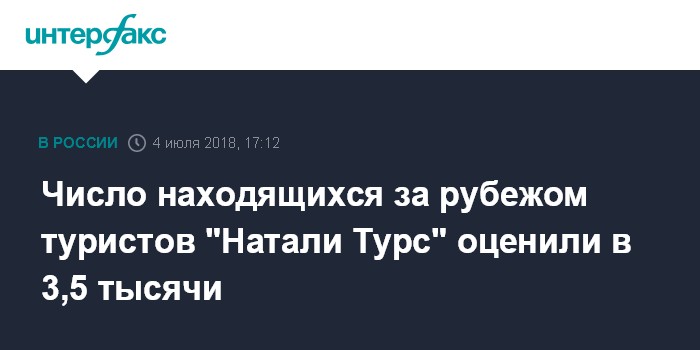 Москва. 4 июля. INTERFAX.RU - Глава Ростуризма Олег Сафонов оценил число туристов "Натали Турс", находящихся за рубежом, в 3,5 тысячи человек, DSBW Tours - в 250 человек.