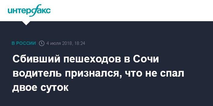 Москва. 4 июля. INTERFAX.RU - Водитель автомобиля в Сочи, сбивший на тротуаре шестерых пешеходов, признался полиции, что уснул за рулем, так как до этого не спал двое суток, работая таксистом, сообщил агентству "Интерфакс" информированный источник.