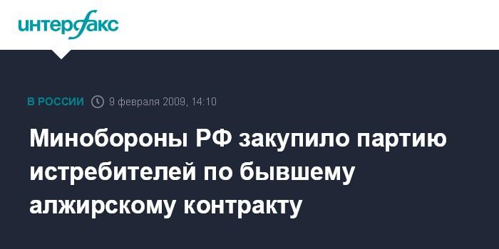 Москва. 9 февраля. INTERFAX.RU - Министерство обороны РФ приняло решение о закупке крупной партии истребителей по бывшему алжирскому контракту на сумму 25 млрд рублей, сообщил вице-премьер РФ Сергей Иванов в ходе заседания президиума правительства в понедельник.