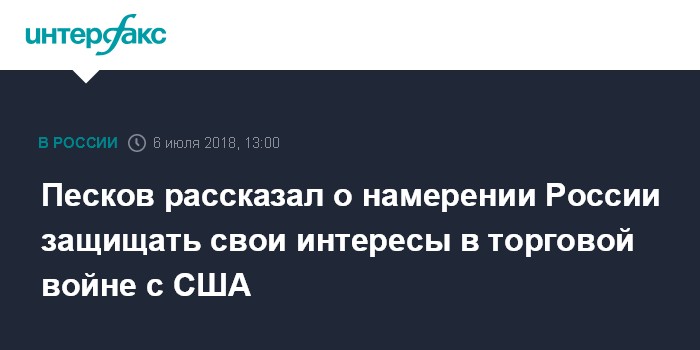 Москва. 6 июля. INTERFAX.RU - В Кремле заявили, что Россия примет меры для защиты своих интересов в связи с разворачивающейся торговой войной между США и другими крупными мировыми игроками.