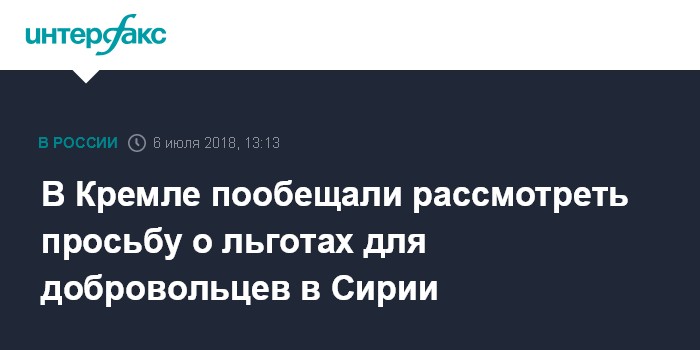 Москва. 6 июля. INTERFAX.RU - Пресс-секретарь президента РФ Дмитрий Песков заявил, что в случае поступления в Кремль обращения ветеранских организаций о присвоении воюющим в Сирии добровольцам льгот, оно будет рассмотрено.