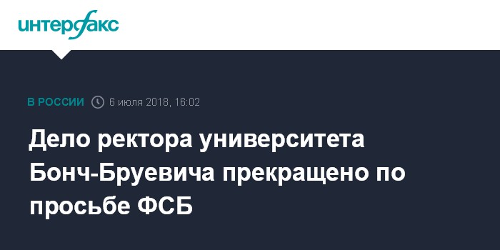 Москва. 6 июля. INTERFAX.RU - Дело ректора Университета телекоммуникаций имени Бонч-Бруевича Сергея Бачевского о превышении полномочий прекращено по ходатайству ФСБ.