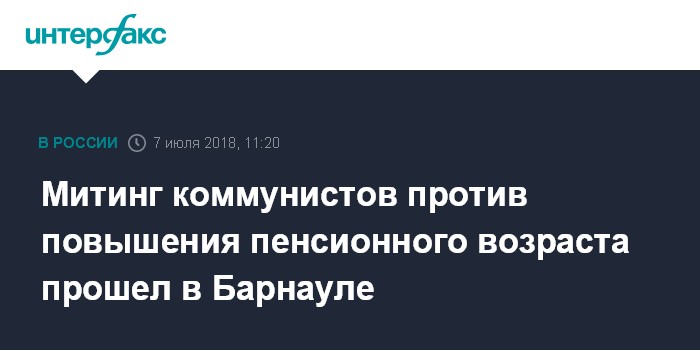 Москва. 7 июля. INTERFAX.RU - На площади Свободы в Барнауле (Алтайский край) состоялся митинг, организованный региональным отделением партии КПРФ против планируемого повышения пенсионного возраста.
