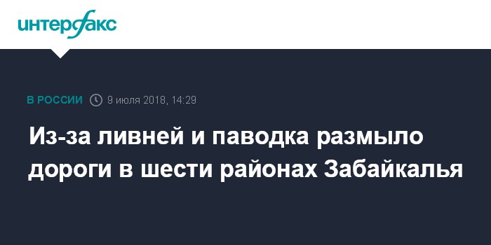 В частности, пострадали участки автодорог Дарасун - Солнцево в Карымском районе, нет подъезда к селам Олекан, Илим и Зюльзя в Нерчинском районе, говорится в сообщении. Размыты участки автодорог Вершино-Дарасунский - Верх-Усугли и Усугли - Кыкер - Тунгокочен, а также подъезд к поселку Вершино-Дарасунский Тунгокоченского района.