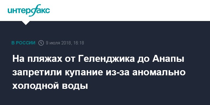 Москва. 9 июля. INTERFAX.RU - Жителям и гостям черноморских курортов Краснодарского края от Геленджика до Анапы запретили купание в море из-за аномально низкой температуры морской воды, запрет может продлиться несколько дней.