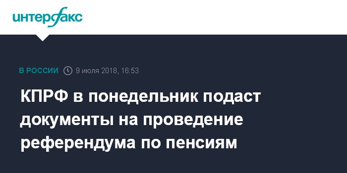 Москва. 9 июля. INTERFAX.RU - Инициативная группа Центрального комитета и московского горкома КПРФ подает в Мосгоризбирком документы на проведение всероссийского референдума об изменении пенсионного законодательства, заявил первый зампредседателя ЦК партии Иван Мельников.