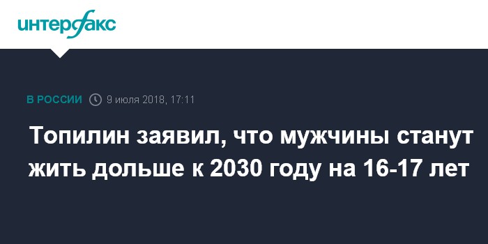 Москва. 9 июля. INTERFAX.RU - Продолжительность жизни мужчин в 2030 году будет на 16-17 лет выше, чем в начале 21 века, заявил министр труда и социальной защиты РФ Максим Топилин.