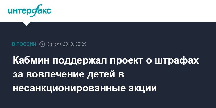 Соответствующий отзыв кабинета министров имеется в распоряжении "Интерфакса". "Законопроект направлен на предупреждение участия несовершеннолетних в несанкционированных публичных мероприятиях, в связи с чем является актуальным и заслуживает поддержки", - говорится в заключении правительства.