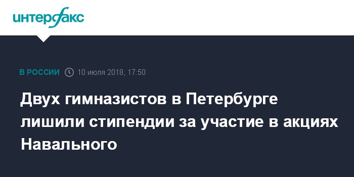 Москва. 10 июля. INTERFAX.RU - Двое выпускников Второй Санкт-Петербургской гимназии были лишены стипендии по итогам года, поскольку состояли на учете в полиции после участия в акциях оппозиционера Алексея Навального, сообщили "Интерфаксу" в приемной образовательного учреждения во вторник.