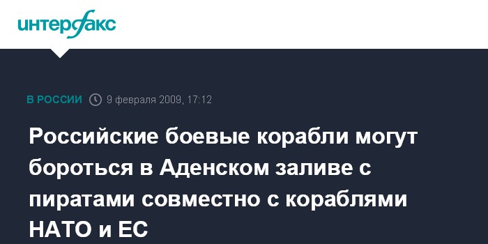 "Не исключается возможность участия российских боевых кораблей в совместных антипиратских действиях с кораблями ВМС государств, работающих в Аденском заливе по национальным планам. Это могут быть как учения соответствующей направленности, так и практические действия по предупреждению пиратских нападений", - сообщил И.Дыгало "Интерфаксу-АВН" в понедельник.