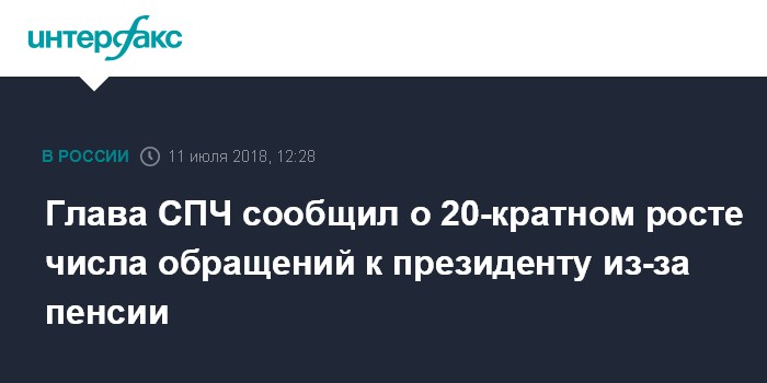 "Сказать, что тема пенсионных накоплений волнует наше общество, значит, ничего не сказать. С 14 по 30 июня 2016 года в адрес президента поступило 128 обращений по вопросам пенсионного обеспечения, в 2017 году их было уже 182, а вот в нынешнем году количество обращений в адрес президента за те же две недели увеличилось в 20 раз", - сказал Федотов в среду на заседании СПЧ, посвященном проекту пенсионной реформы.
