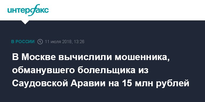 Москва. 11 июля. INTERFAX.RU - Московские правоохранительные органы установили личность мошенника из Ливана, похитившего у болельщика из Саудовской Аравии 15,5 млн рублей, пообещав организовать перелет из Москвы в Волгоград для него и его друзей, сообщил "Интерфаксу" в среду осведомленный источник.