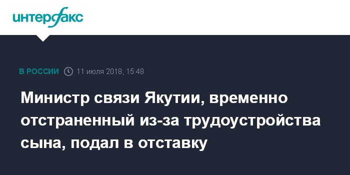 Министр связи Якутии, временно отстраненный из-за трудоустройства сына, подал в отставку