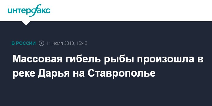 Москва. 11 июля. INTERFAX.RU - Прокуратура Ставропольского края начала проверку в связи с массовой гибелью рыбы в реке Дарья в Предгорном районе, сообщили агентству "Интерфакс" в среду в пресс-службе региональной прокуратуры.