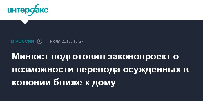 Москва. 11 июля. INTERFAX.RU - Минюст России подготовил проект поправок в Уголовно-исполнительный кодекс РФ, который позволит осужденным отбывать наказание в том регионе, где живут их близкие родственники, сообщает пресс-служба уполномоченного по правам человека в Ленинградской области Сергея Шабанова.