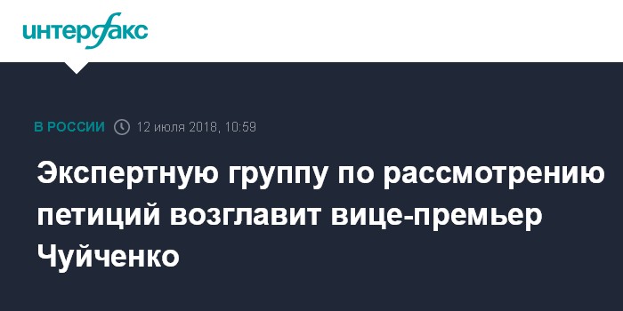 Москва. 12 июля. INTERFAX.RU - Вице-премьер, руководитель аппарата правительства Константин Чуйченко, как ожидается, возглавит федеральную экспертную рабочую группу, которая будет рассматривать петиции, преодолевшие планку в 100 тысяч голосов на сайте "Российской общественной инициативы" (РОИ), сообщил "Интерфаксу" источник, знакомый с ситуацией.