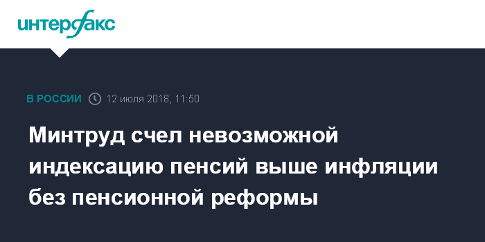 Москва. 12 июля. INTERFAX.RU - Государство не сможет дать гарантии индексации пенсий выше инфляции, если пенсионный возраст не будет поднят, заявил замминистра труда и социальной защиты РФ Андрей Пудов.