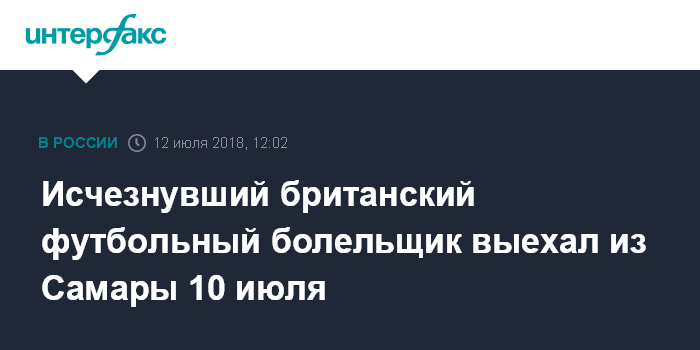 Москва. 12 июля. INTERFAX.RU - Британский футбольный болельщик Дуглас Моретон, о пропаже которого на ЧМ-2018 сообщили в соцсетях его знакомые, выехал из Самары 10 июля в Москву, сообщила агентству "Интерфакс" старший помощник Приволжского транспортного прокурора Майя Иванова.