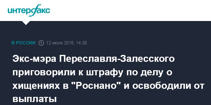 Экс-мэра Переславля-Залесского приговорили к штрафу по делу о хищениях в "Роснано" и освободили от выплаты