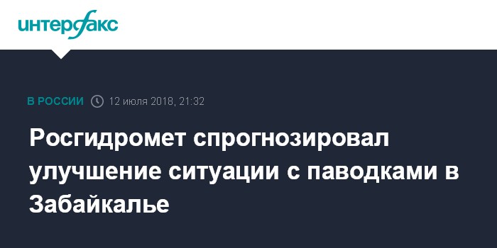 Москва. 12 июля. INTERFAX.RU - В Росгидромете не видят угрозы новых подтоплений в Забайкалье, паводок постепенно сходит на нет в регионе.
