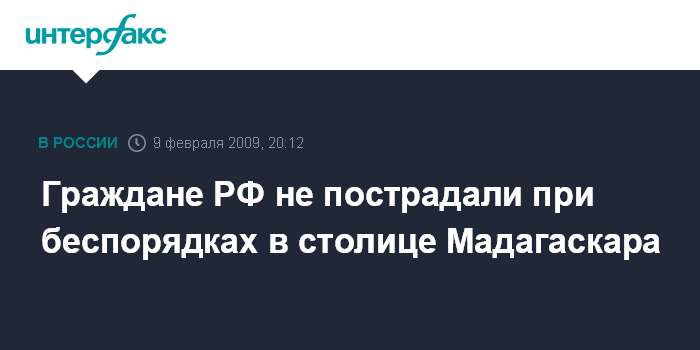 Москва. 9 февраля. INTERFAX.RU - Граждане РФ, находящиеся на Мадагаскаре, не пострадали в ходе беспорядков в столице этой страны Антананариву, сообщает в понедельник МИД РФ.