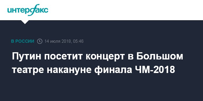 Москва. 14 июля. INTERFAX.RU - Президент России Владимир Путин в субботу, 14 июля посетит Государственный академический Большой театр, где накануне финала чемпионата мира по футболу 2018 пройдет гала-концерт звезд мировой оперы, сообщила пресс-служба Кремля.