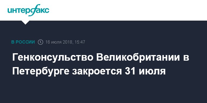 Москва. 16 июля. INTERFAX.RU - Генеральное консульство Великобритании до 1 августа завершит работу в Санкт-Петербурге, сообщил "Интерфаксу" в понедельник источник в дипломатических кругах.