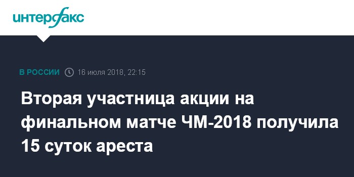 Вторая участница акции на финальном матче ЧМ-2018 получила 15 суток ареста
