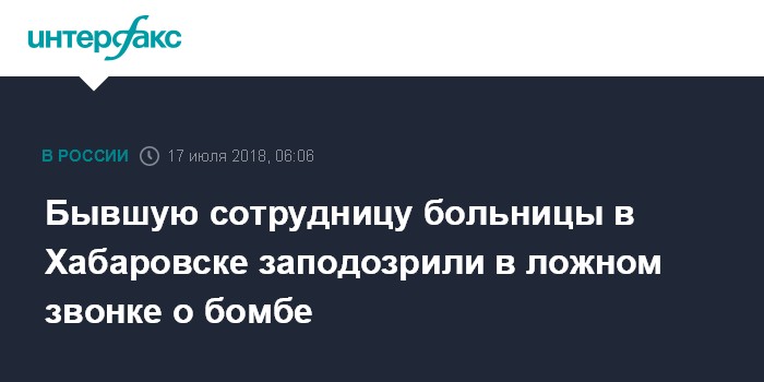 "В дежурную часть УМВД России по Хабаровску 16 июля поступило сообщение от неизвестного об опасности для посетителей и пациентов одной из больниц краевого центра. В ходе оперативно-розыскных мероприятий была задержана бывшая сотрудница лечебного учреждения", - говорится в сообщении.